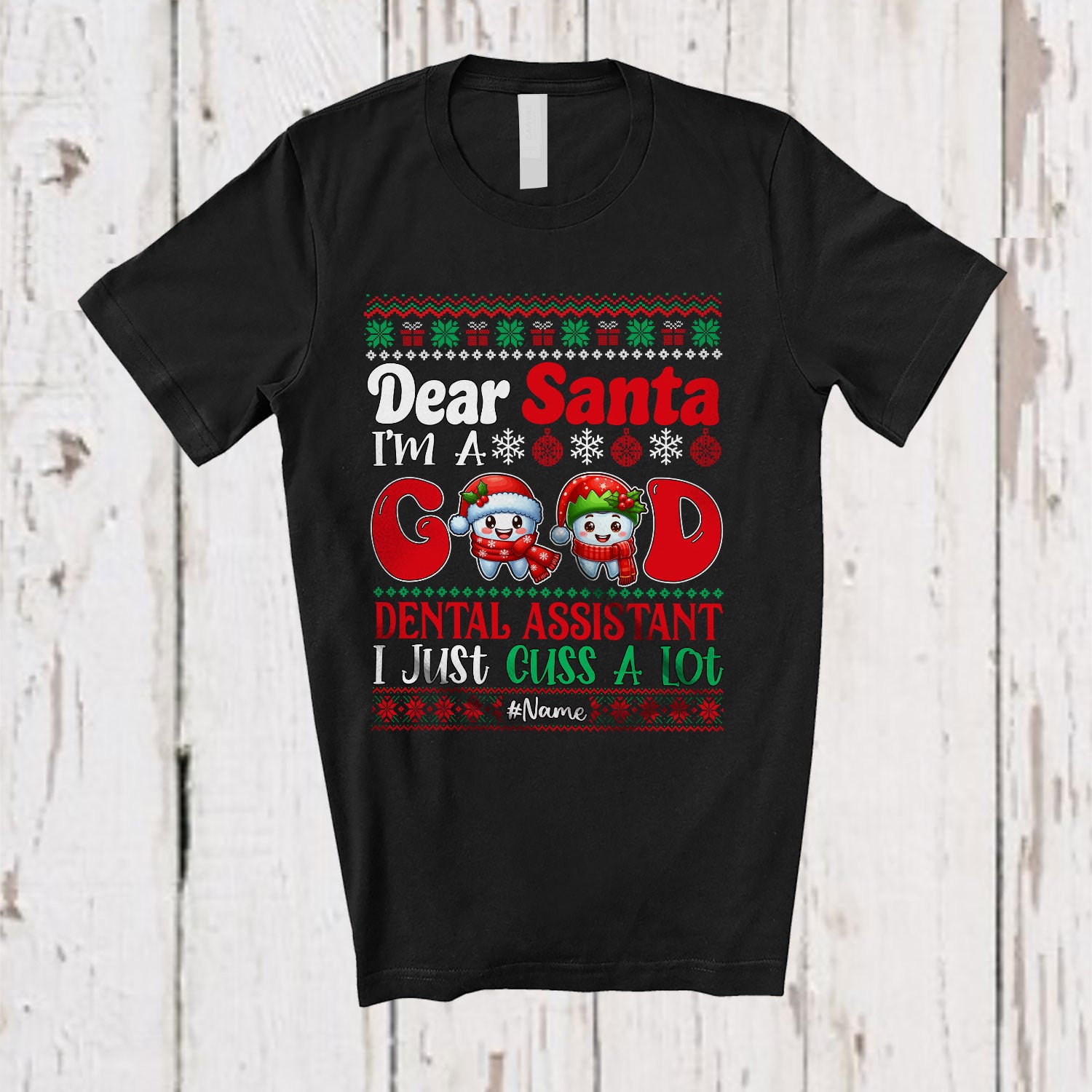 Personalized Santa I'm A Good Dental Assistant; Joyful Christmas Sweater Tooth; Custom Name Dentist T-Shirt. This cotton t-shirt is a durable staple product with a classic fit. One of the most popular items, it has a relaxed style made for everyday and casual wear.