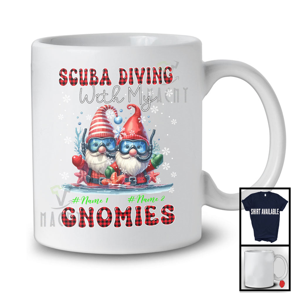 Personalized Scuba Diving With My Gnomies; Lovely Christmas Plaid Custom Name Couple Gnomes T-Shirt