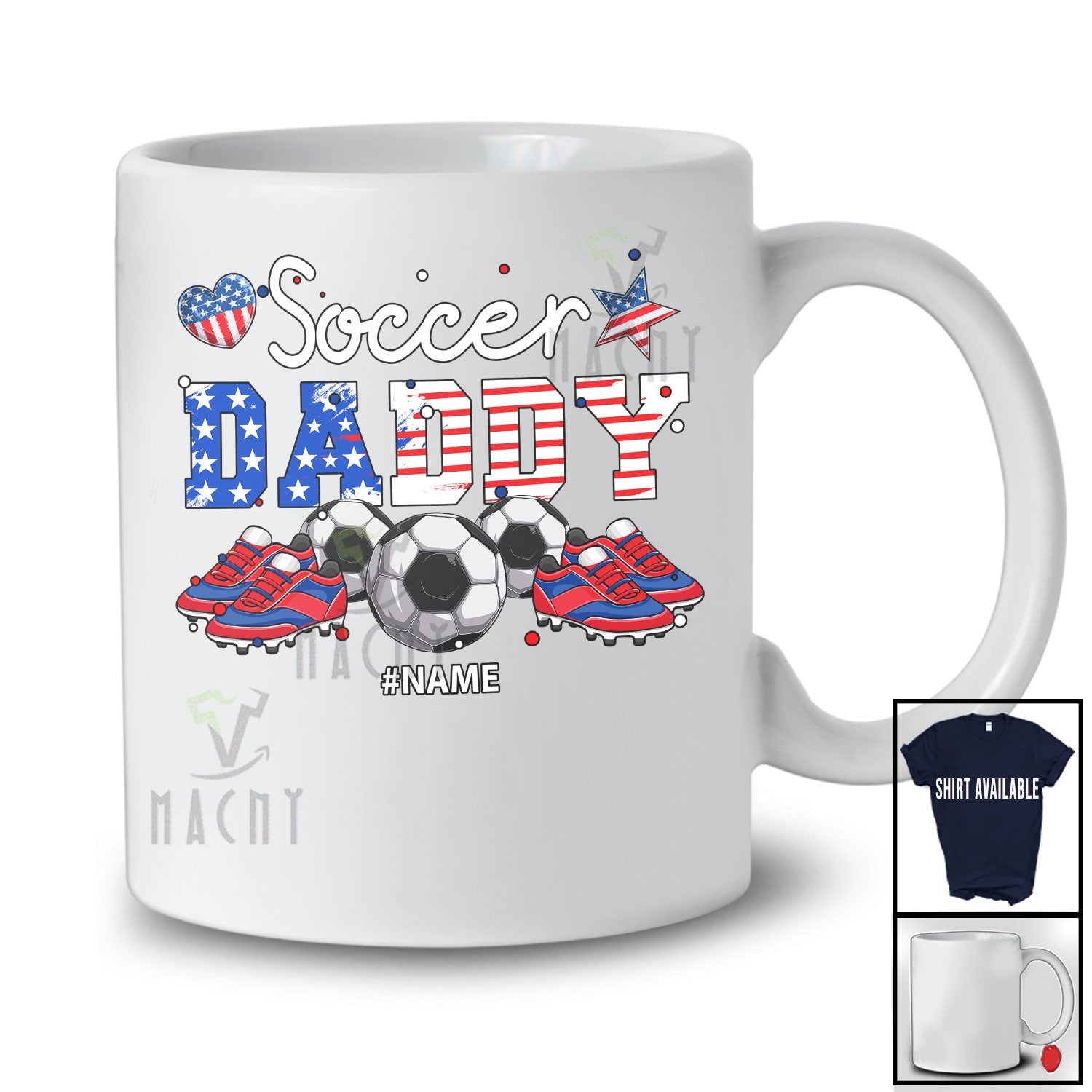 Personalized Soccer Daddy; Awesome 4th Of July Custom Name Soccer Player; Patriotic Family T-Shirt. This cotton t-shirt is a durable staple product with a classic fit. One of the most popular items, it has a relaxed style made for everyday and casual wear.
