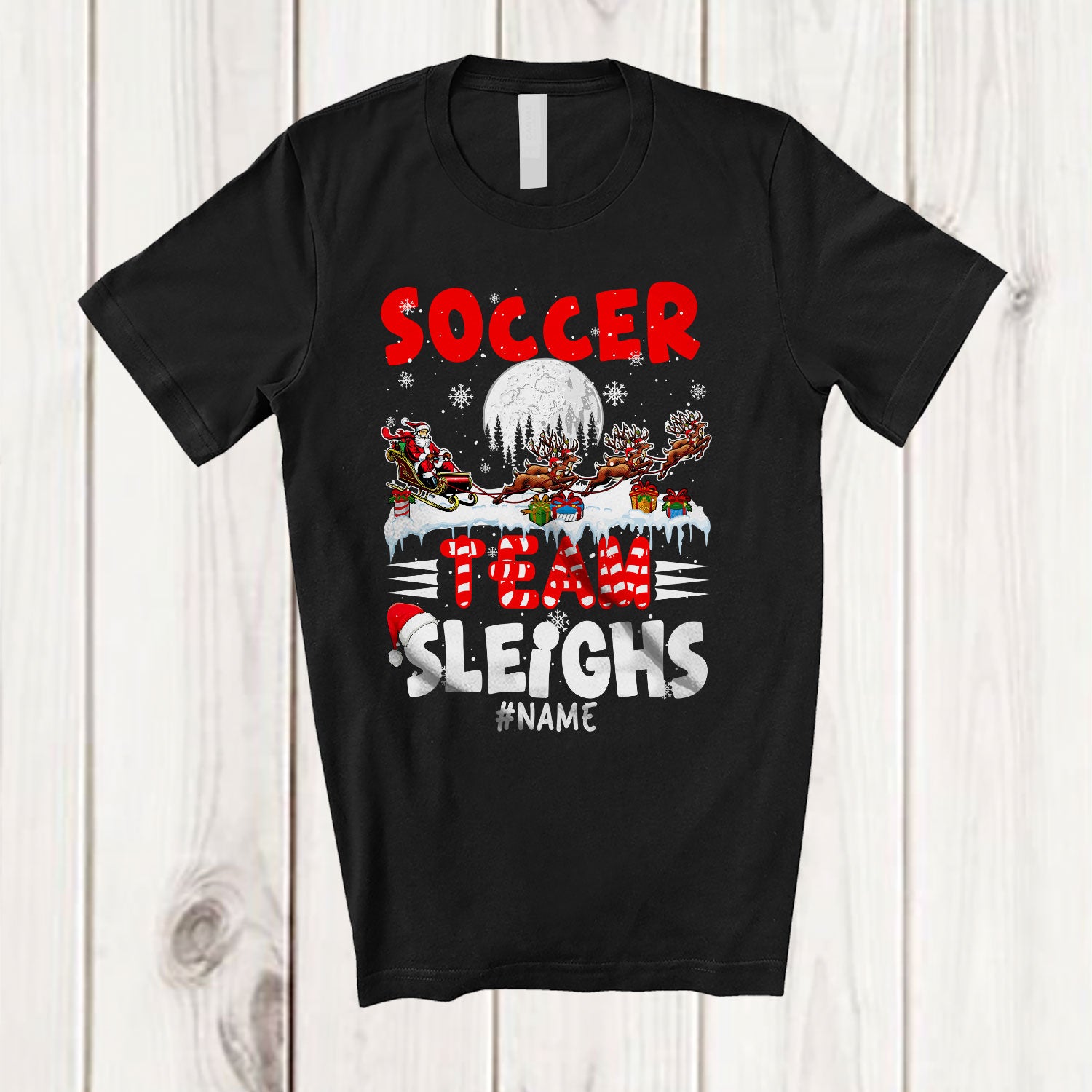 • Personalized Soccer Team Sleighs; Joyful Christmas Santa Sled Reindeer; Custom Name Sport Player T-Shirt. This cotton t-shirt is a durable staple product with a classic fit. One of the most popular items, it has a relaxed style made for everyday and casual wear.