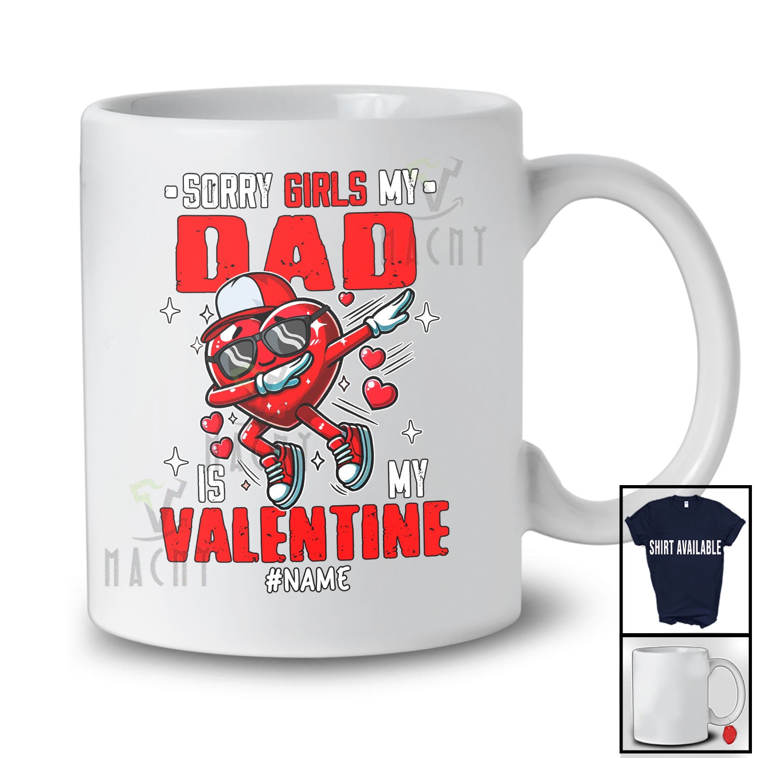 Personalized Sorry Girls My Dad Is My Valentine; Awesome Custom Name Dabbing Hearts; Family T-Shirt. This cotton t-shirt is a durable staple product with a classic fit. One of the most popular items, it has a relaxed style made for everyday and casual wear.
