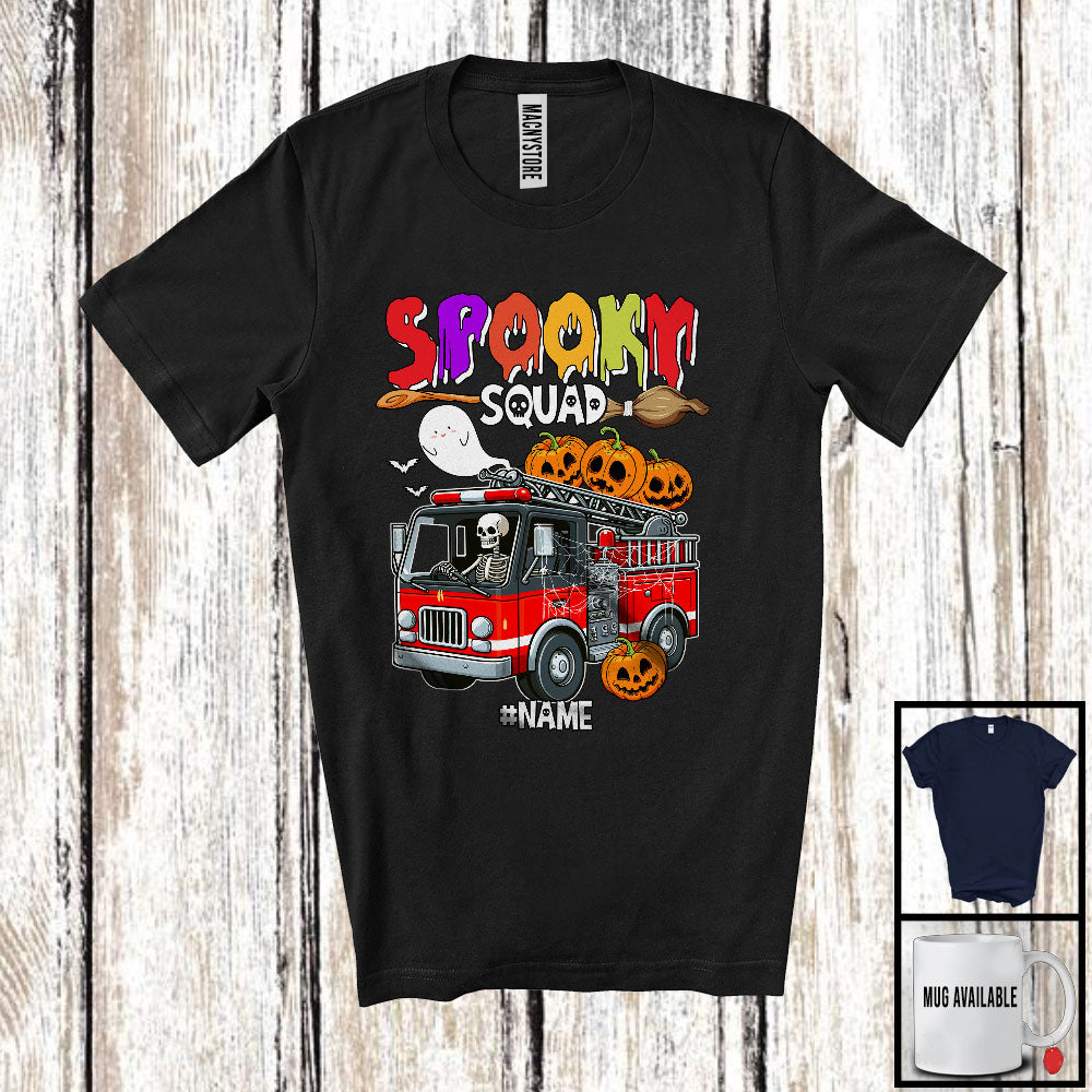 Personalized Spooky Squad; Scary Halloween Skeleton Driving Firetruck; Custom Name Driver T-Shirt