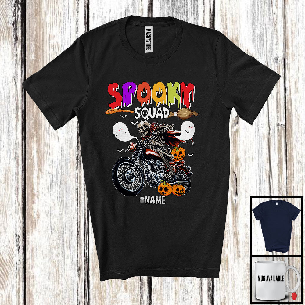 Personalized Spooky Squad; Scary Halloween Skeleton Riding Motorbike; Custom Name Biker T-Shirt