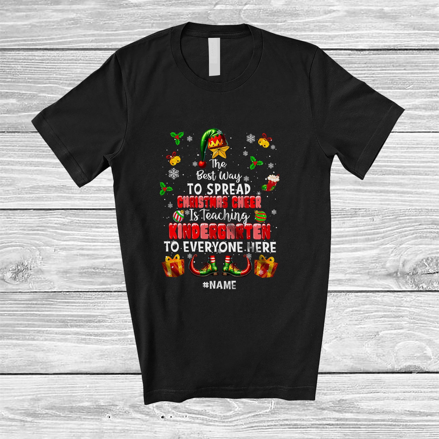 The Personalized Spread Christmas Cheer Is Teaching Kindergarten; Amusing Custom Name Elf Teacher T-Shirt was built with people like you in mind. Something to keep you happy. Every. Single. Day.