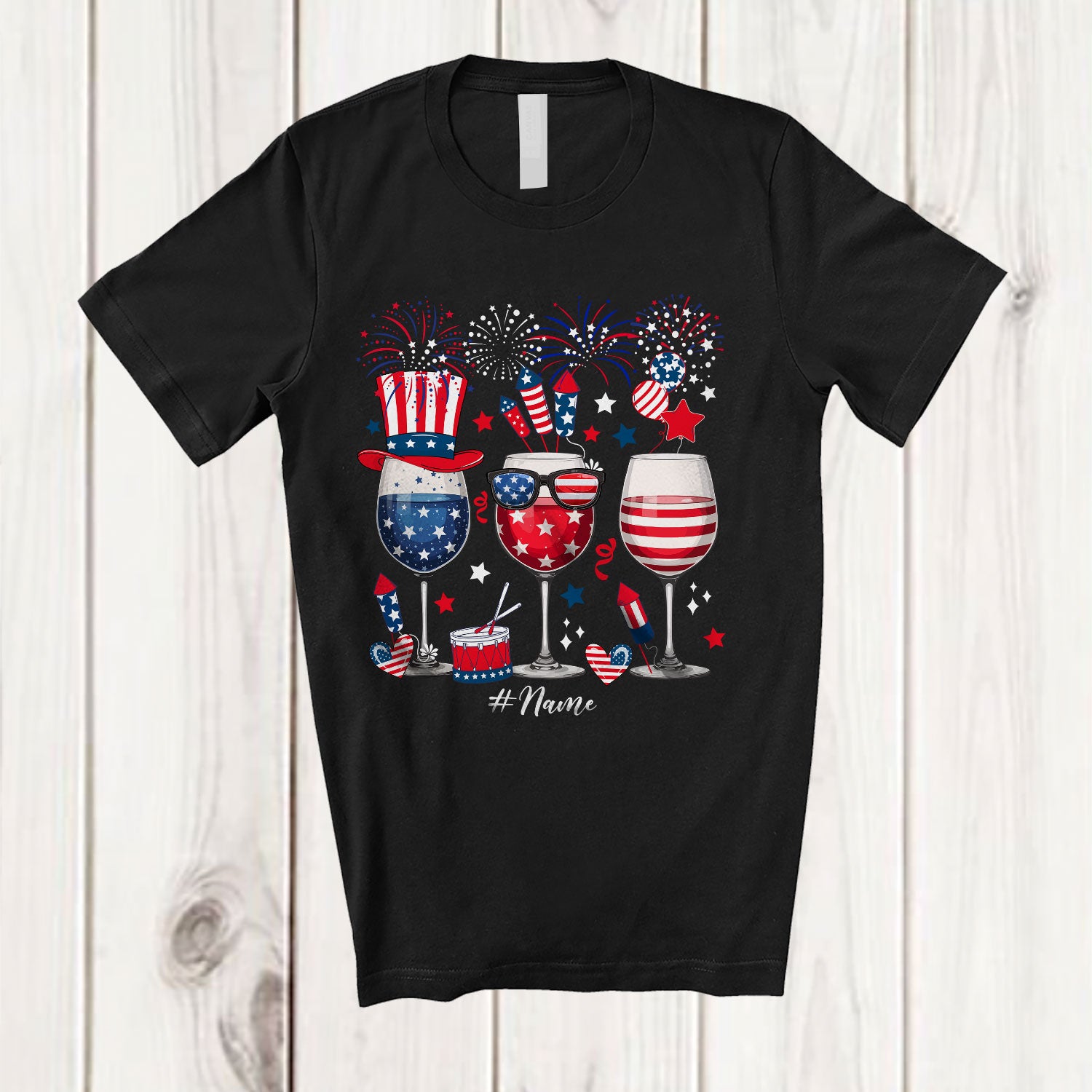 Personalized Three 4th of July Glass Of Wines; Cheerful Custom Name Drunker Patriotic; Drinking T-Shirt