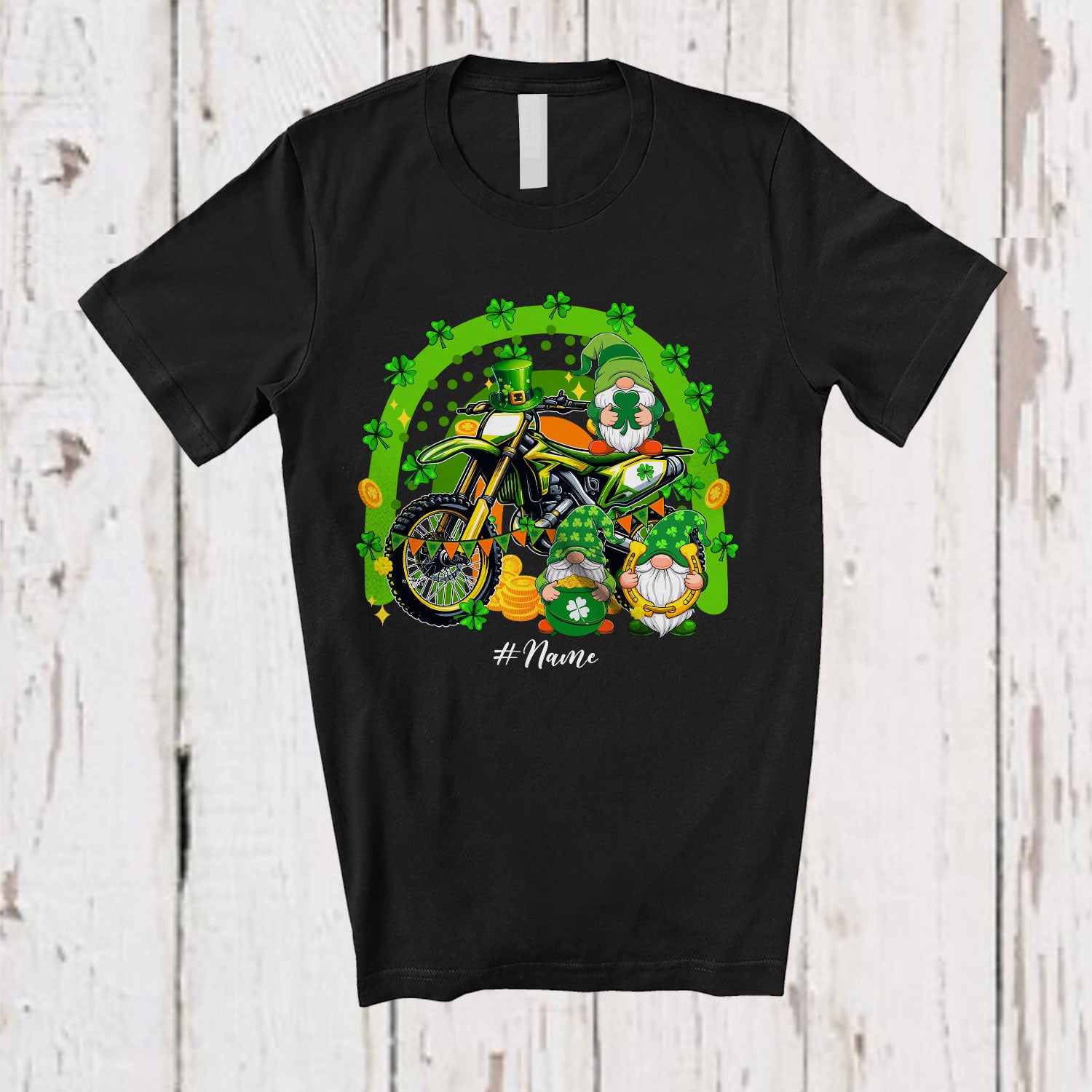 • Personalized Three Gnomes With Dirt Bike; Happy St. Patrick's Day Rainbow; Custom Name Family T-Shirt. This cotton t-shirt is a durable staple product with a classic fit. One of the most popular items, it has a relaxed style made for everyday and casual wear.