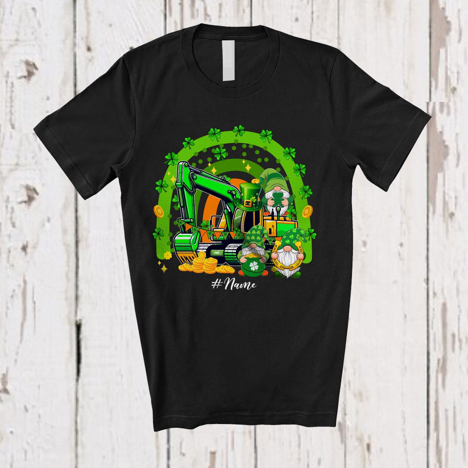 Personalized Three Gnomes With Excavator; Happy St. Patrick's Day Rainbow; Custom Name Family T-Shirt. This cotton t-shirt is a durable staple product with a classic fit. One of the most popular items, it has a relaxed style made for everyday and casual wear.