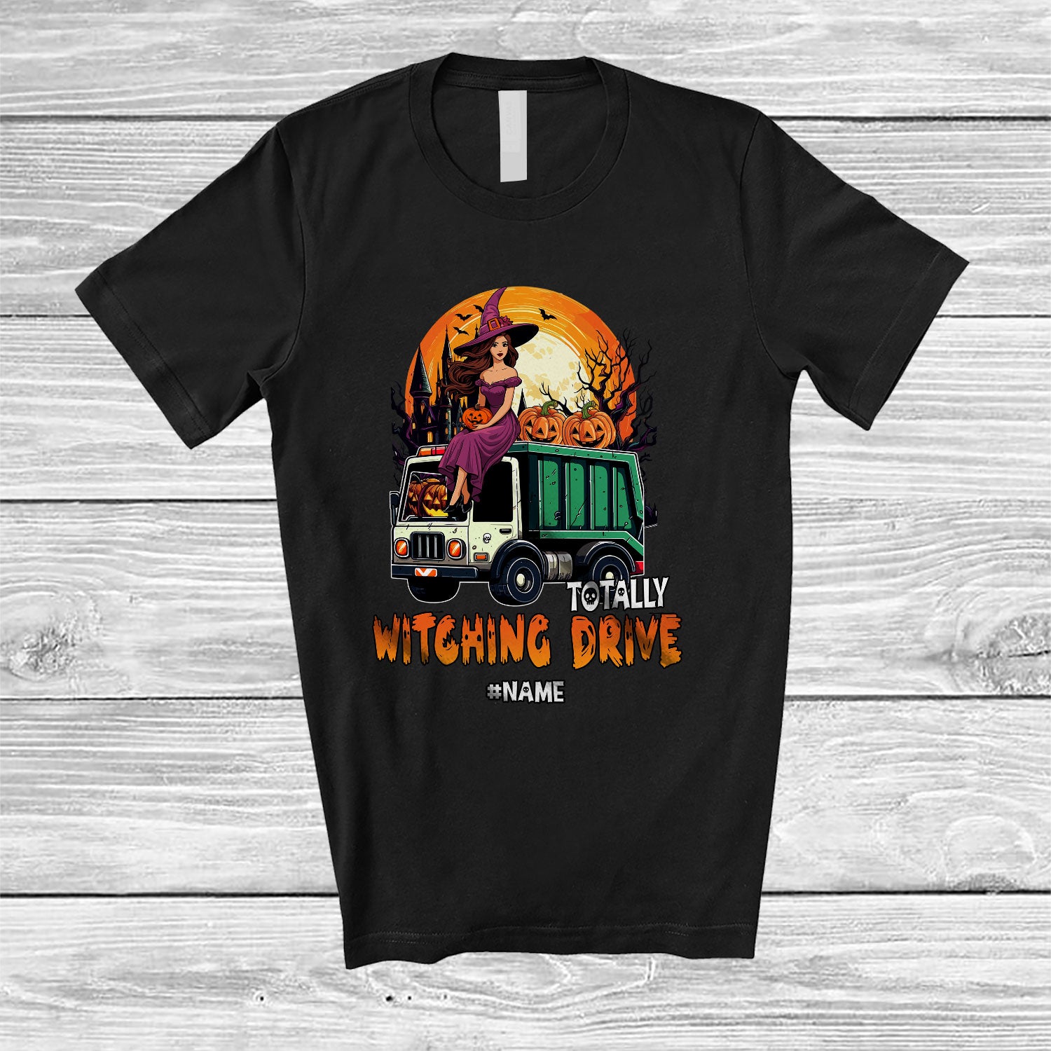 Personalized Totally Witching Drive; Joyful Halloween Moon Custom Name Witch Driving Garbage Truck T-Shirt