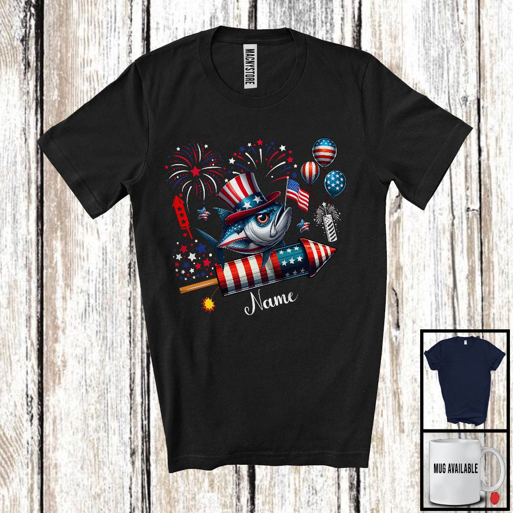 Personalized Tuna Riding Firecracker, Lovely 4th Of July USA Flag Custom Name, Fish Sea Animal T-Shirt