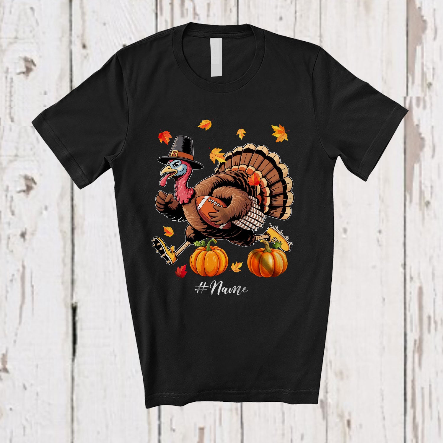 Personalized Turkey Playing Football; Awesome Thanksgiving Fall Leaves Custom Name Player T-Shirt