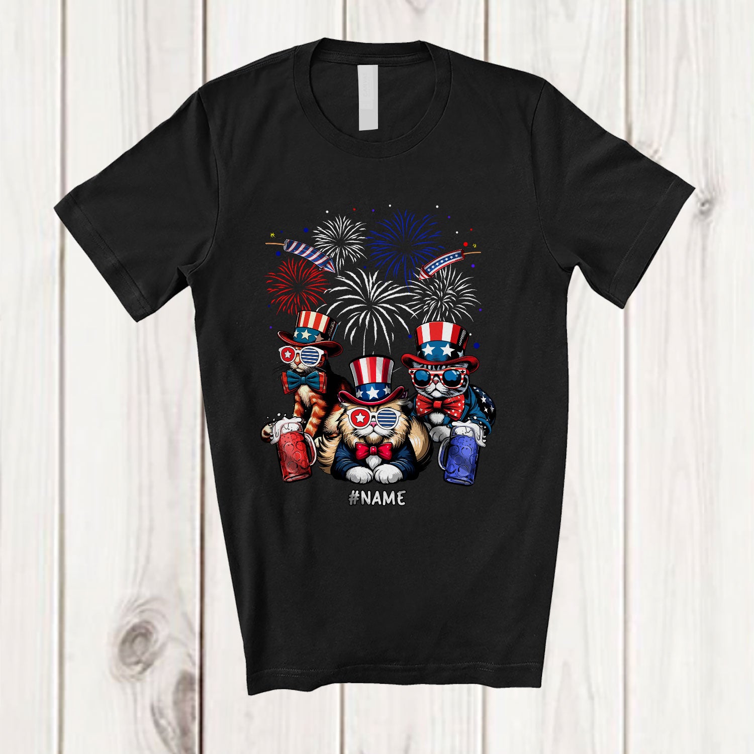 Personalized US Flag Three Cat Sunglasses; Lovely 4th Of July Custom Name Patriotic T-Shirt
