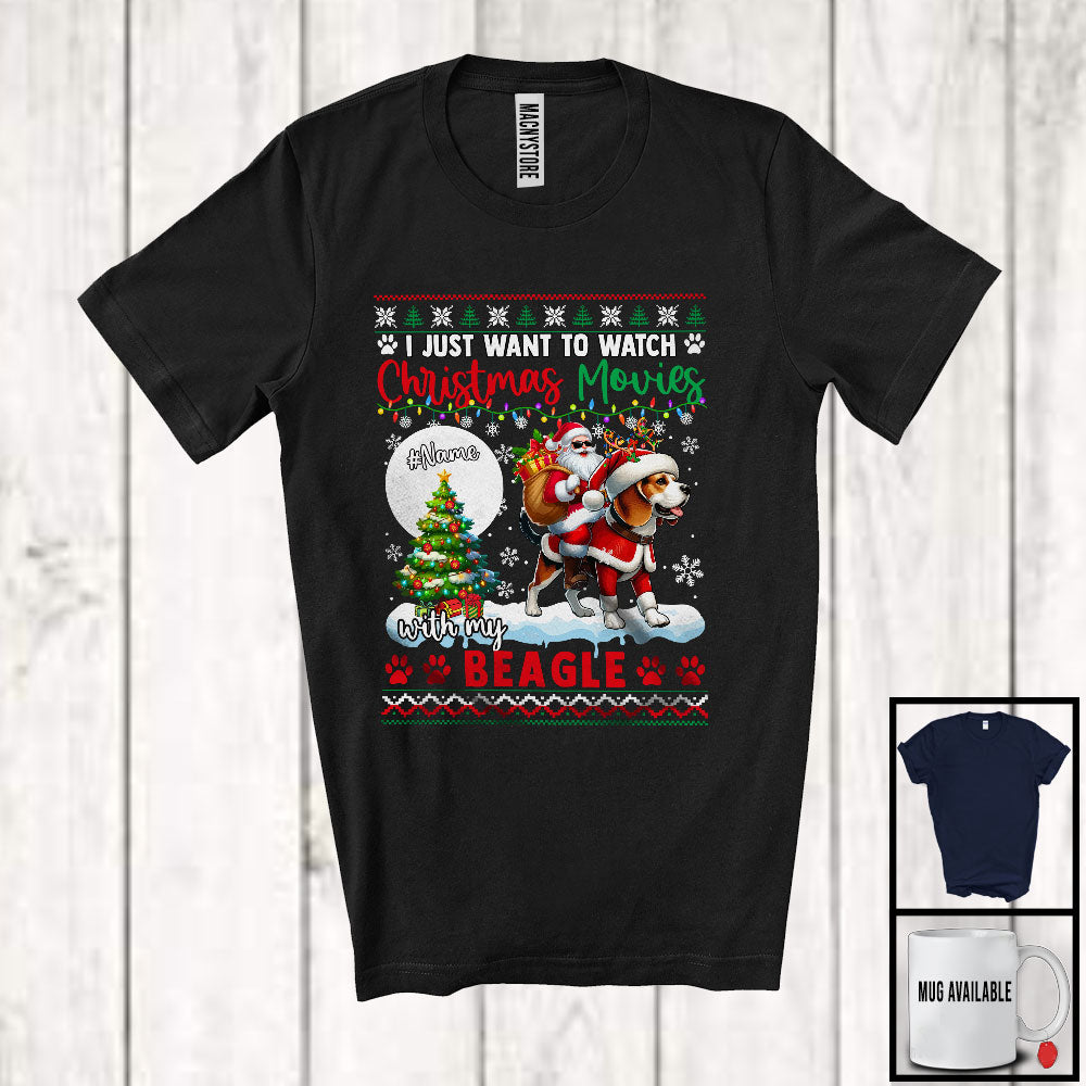 • Personalized Watch Christmas Movies With My Beagle; Joyful Santa Riding Puppy; X-mas Tree T-Shirt. This cotton t-shirt is a durable staple product with a classic fit. One of the most popular items, it has a relaxed style made for everyday and casual wear.