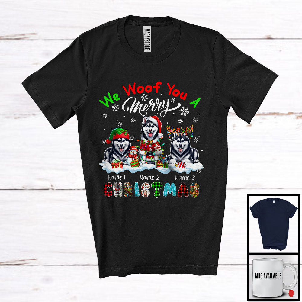 Personalized We Woof You A Merry Christmas; Lovely Plaid Huskies Custom Name T-Shirt
