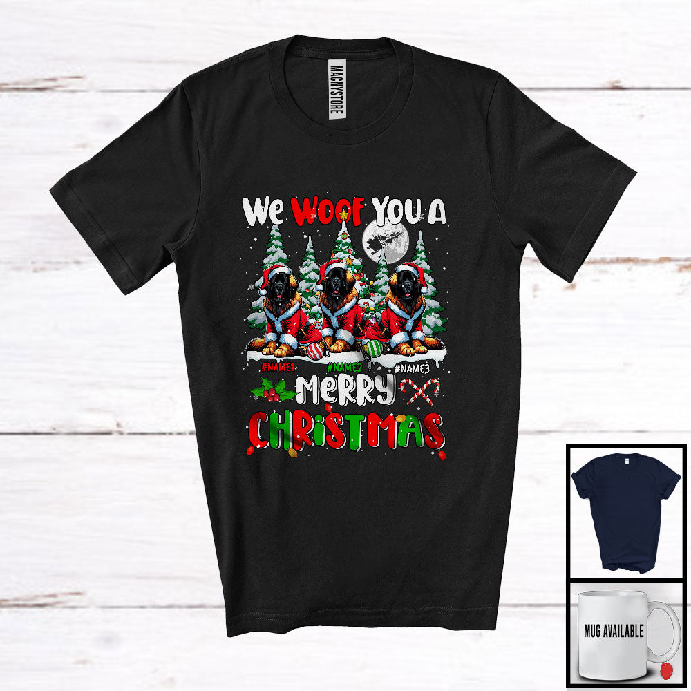 Personalized We Woof You A Merry Christmas; Lovely Three Santa Leonbergers; X-mas Tree T-Shirt