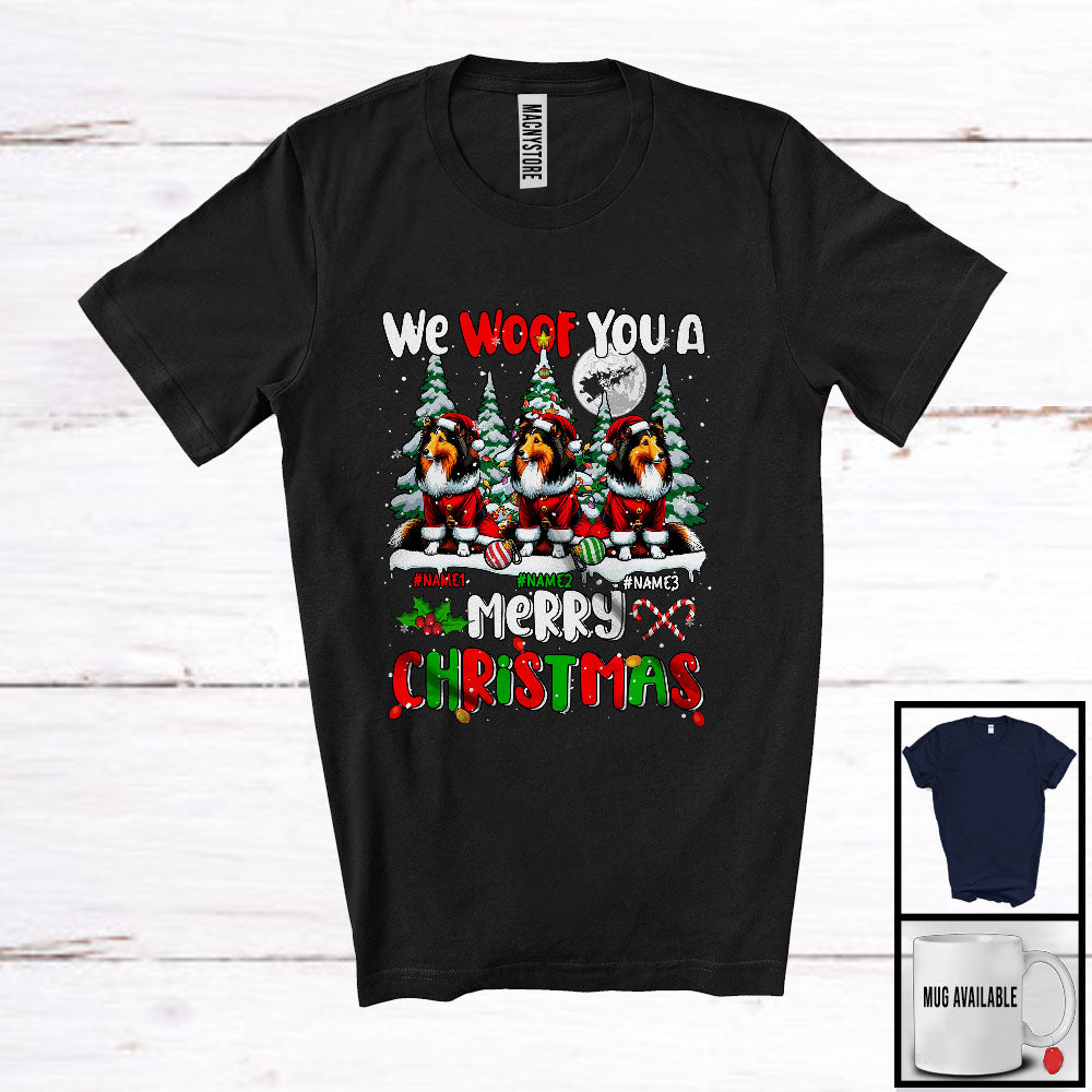 Personalized We Woof You A Merry Christmas; Lovely Three Santa Shelties; X-mas Tree T-Shirt