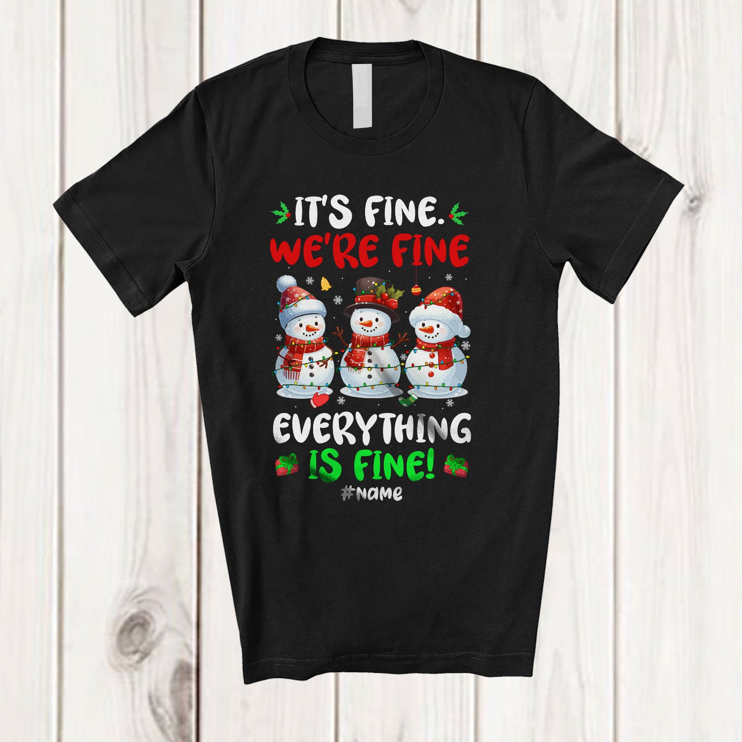 • Personalized We're Fine Everything; Lovely Christmas Three Snowman; Custom Name Teacher T-Shirt. This cotton t-shirt is a durable staple product with a classic fit. One of the most popular items, it has a relaxed style made for everyday and casual wear.