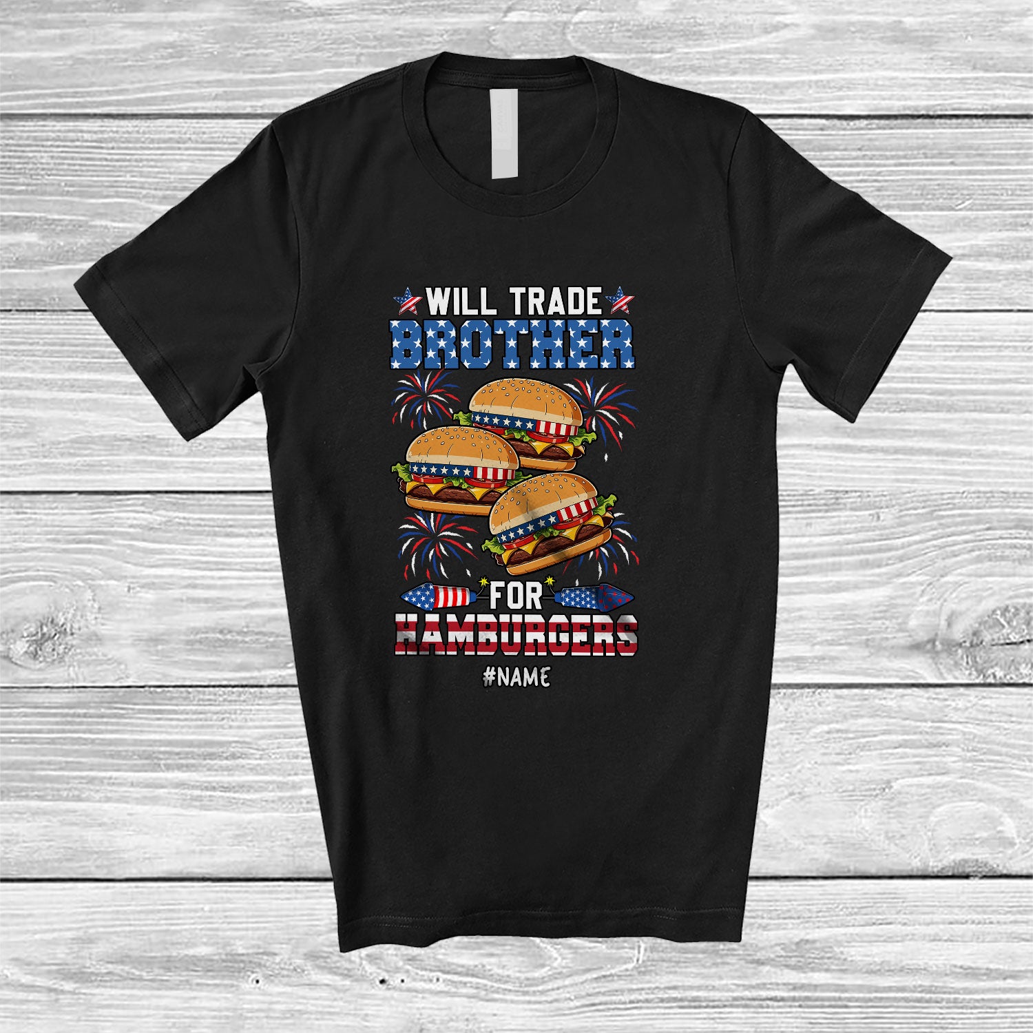 Personalized Will Trade Brother For Hamburgers; Joyful 4th of July Custom Name Family; Patriotic T-Shirt. This cotton t-shirt is a durable staple product with a classic fit. One of the most popular items, it has a relaxed style made for everyday and casual wear.
