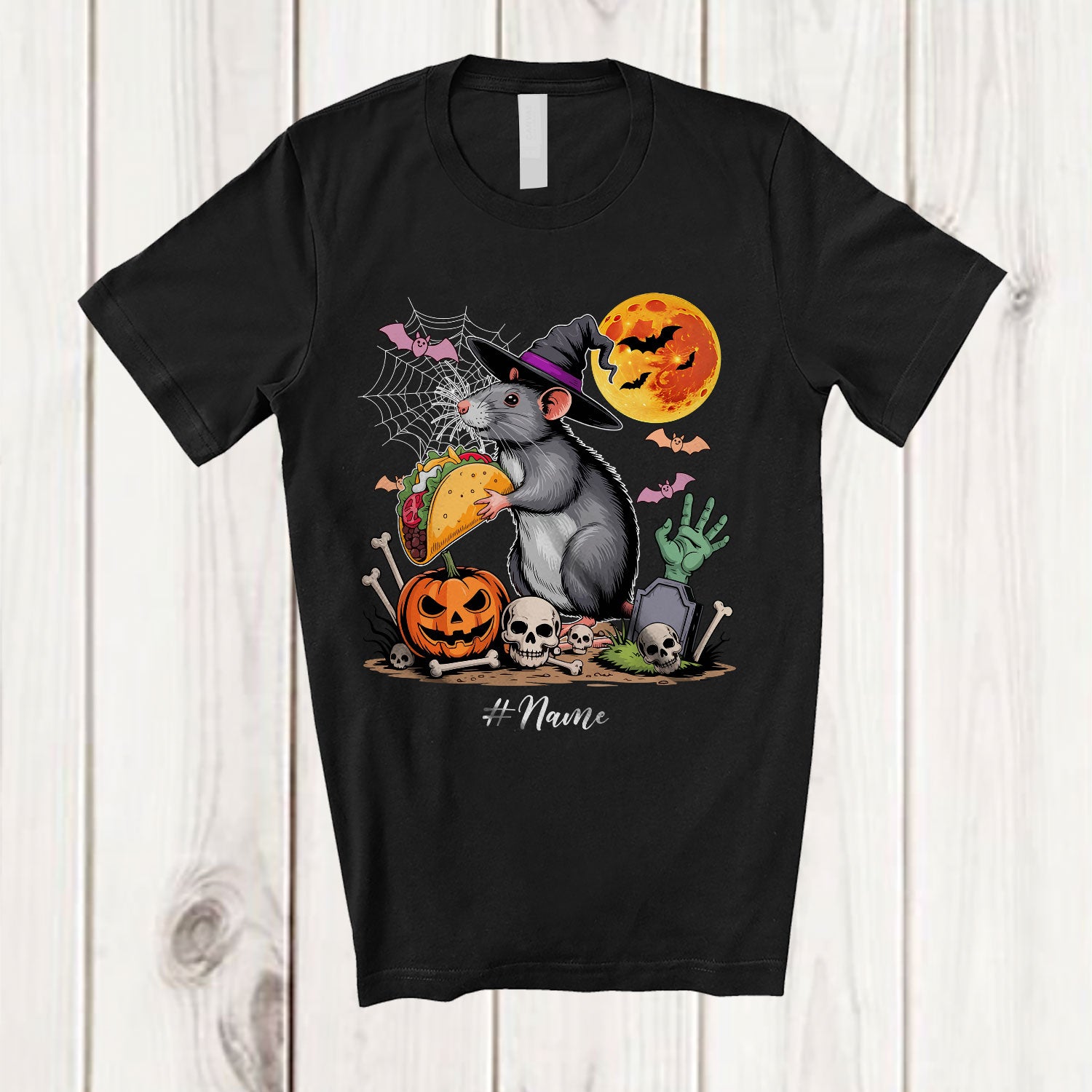 Personalized Witch Rat Holding Taco; Humorous Halloween Custom Name Lunch Lady Chef T-Shirt