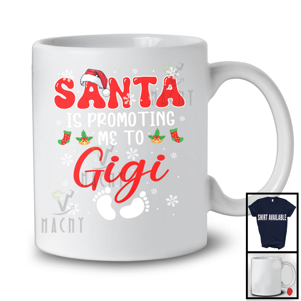 Santa Is Promoting Me To Gigi; Cheerful Christmas Pregnancy Announcement Santa; Snow Family T-Shirt. This cotton t-shirt is a durable staple product with a classic fit. One of the most popular items, it has a relaxed style made for everyday and casual wear.