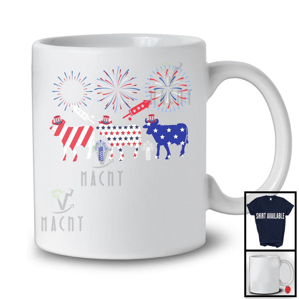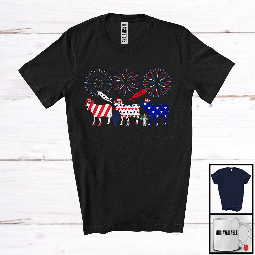 Three American Flag Cow, Wonderful 4th Of July Fireworks, Farm Animals Farmer Patriotic T-Shirt
