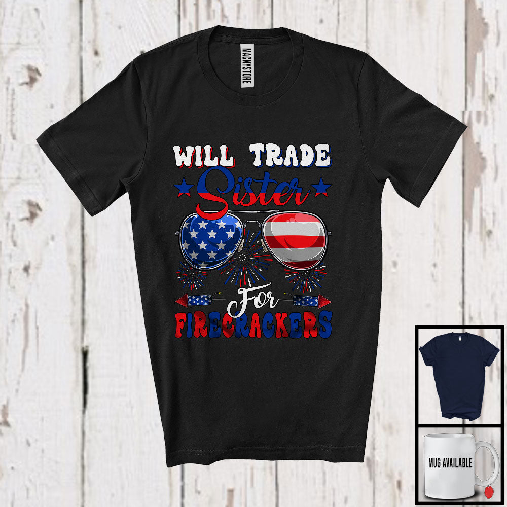 Will Trade Sister For Firecrackers, Cheerful 4th Of July American Flag Sunglasses, Patriotic Family T-Shirt