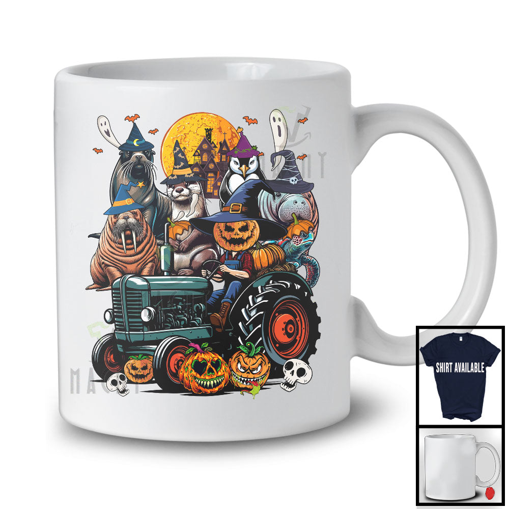Witch Manatee Otter Penguin On Tractor, Horror Halloween Sea Animals, Driving Tractor Driver T-Shirt