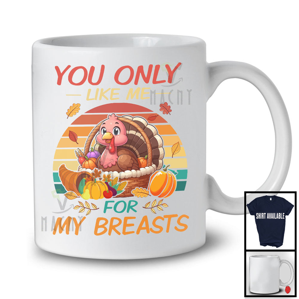 This You Only Like Me For My Breasts, Humorous Thanksgiving Turkey Women, Retro Fall Pumpkins T-Shirt is great idea gift for your family, friends in this birthday, christmas, mother's day, father's day, patrick's day or any holiday.
