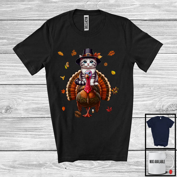 Cat Pilgrim Riding Turkey; Amazing Thanksgiving Autumn Leaves Cat Turkey; Family Group T-Shirt
