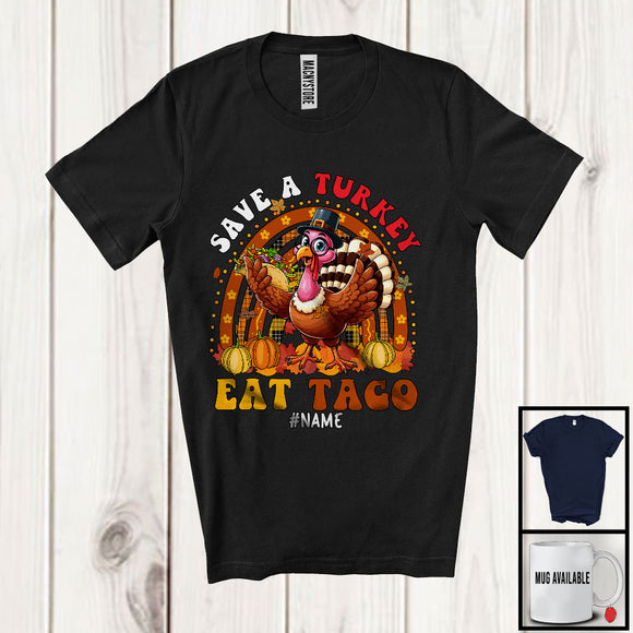 Personalized Custom Name Save A Turkey Eat Taco; Happy Thanksgiving Plaid Rainbow Turkey T-Shirt