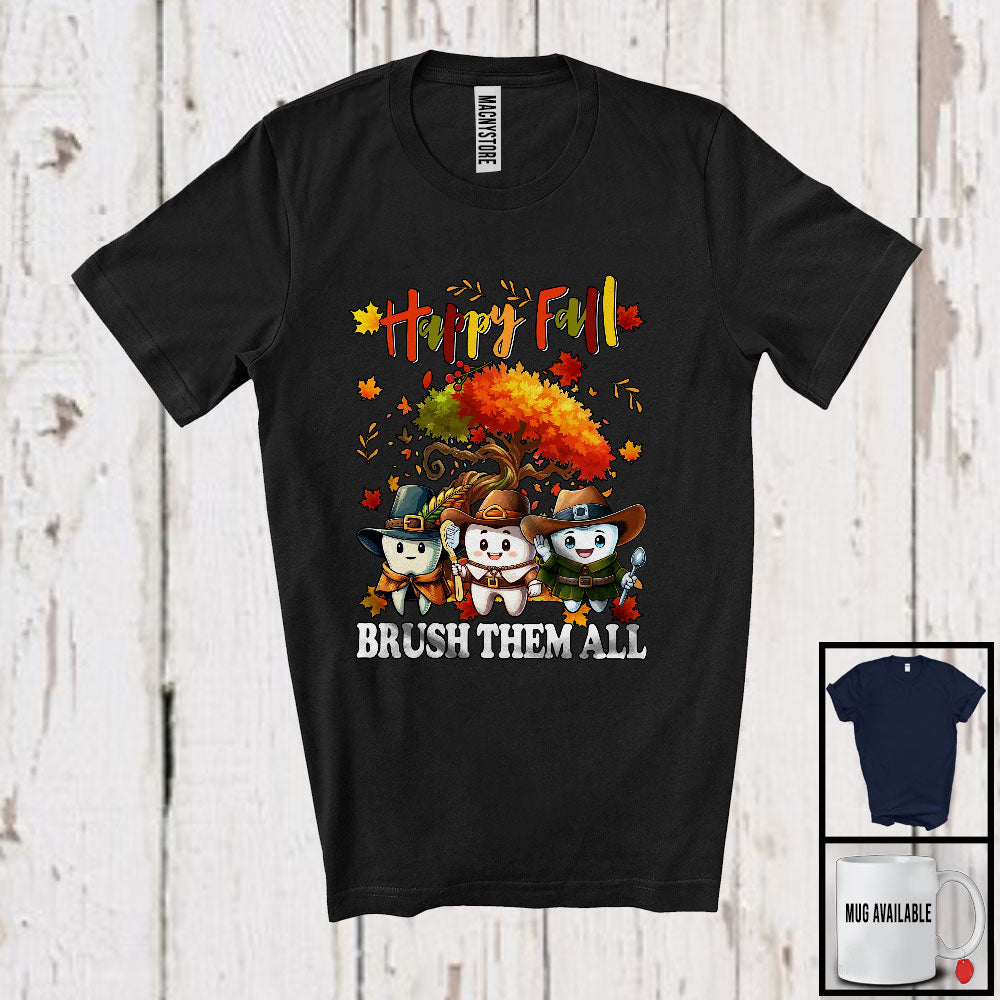Happy Fall Brush Them All; Lovely Thanksgiving Three Teeth Fall Tree; Dental Dentist Group T-Shirt