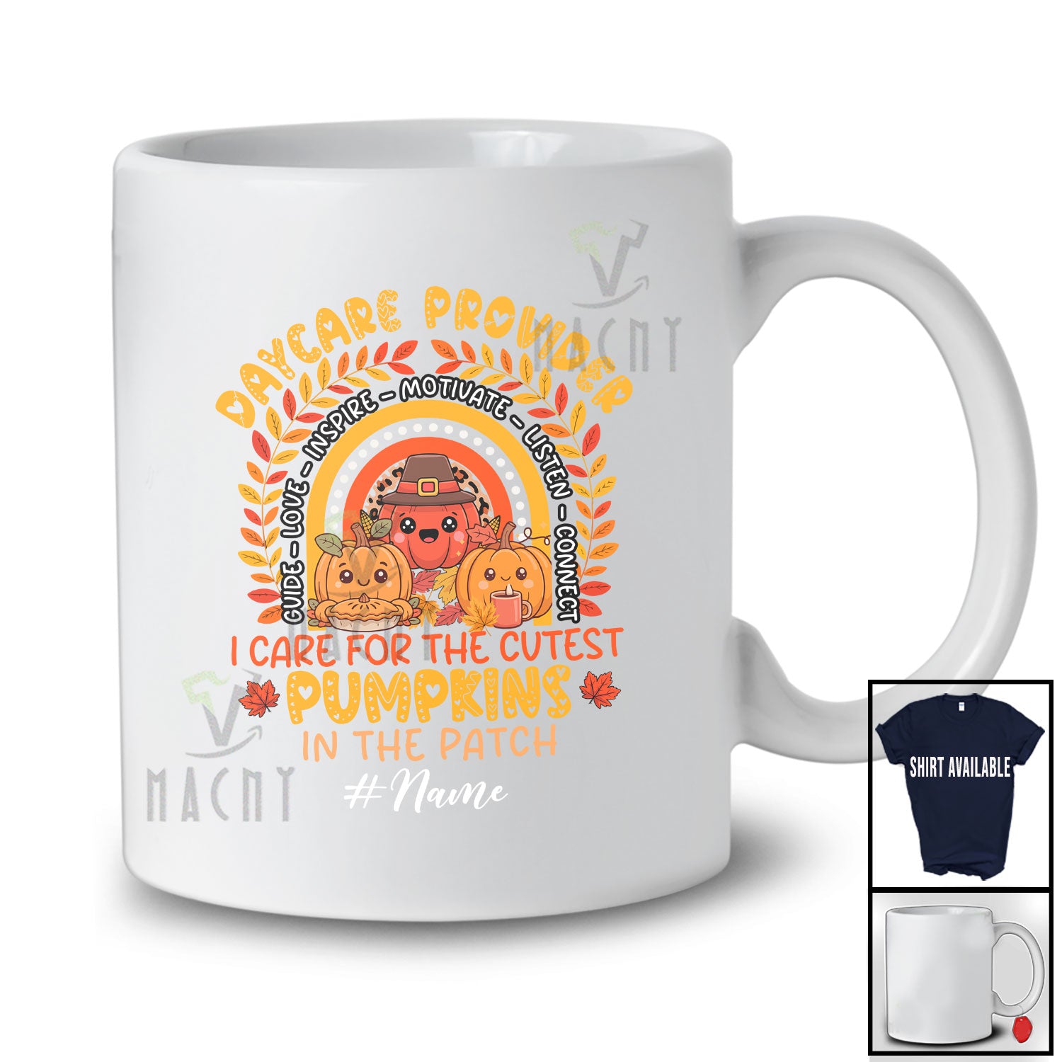 • Personalized Custom Name Daycare Provider I Care Cutest Pumpkins; Proud Thanksgiving Rainbow T-Shirt. This cotton t-shirt is a durable staple product with a classic fit. One of the most popular items, it has a relaxed style made for everyday and casual wear.