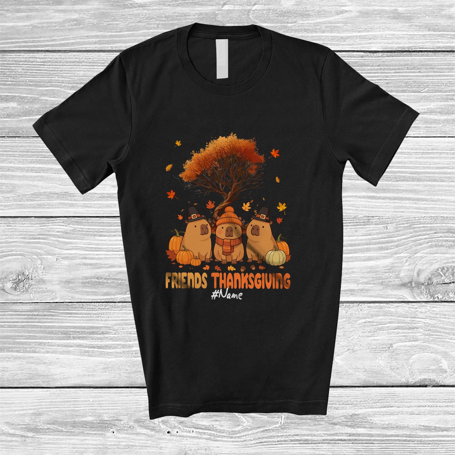 • Personalized Custom Name Friends Thanksgiving; Lovely Fall Autumn Tree Three Three Capybara T-Shirt. This cotton t-shirt is a durable staple product with a classic fit. One of the most popular items, it has a relaxed style made for everyday and casual wear.