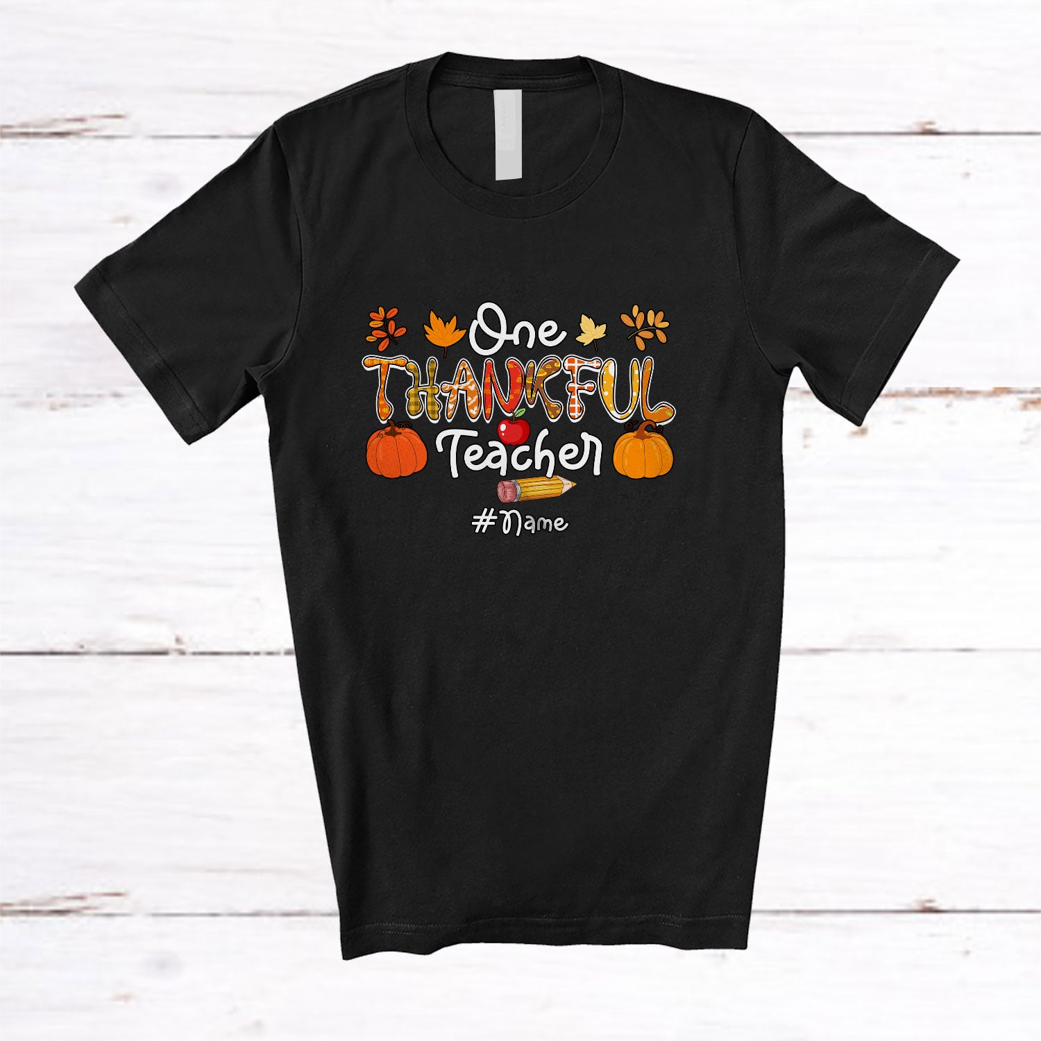 • Personalized Custom Name One Thankful Teacher; Proud Thanksgiving Jobs Turkey T-Shirt. This cotton t-shirt is a durable staple product with a classic fit. One of the most popular items, it has a relaxed style made for everyday and casual wear.