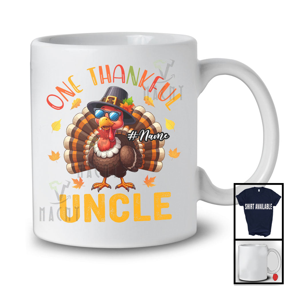 • Personalized Custom Name One Thankful Uncle; Lovely Thanksgiving Turkey Sunglasses; Family T-Shirt. This cotton t-shirt is a durable staple product with a classic fit. One of the most popular items, it has a relaxed style made for everyday and casual wear.