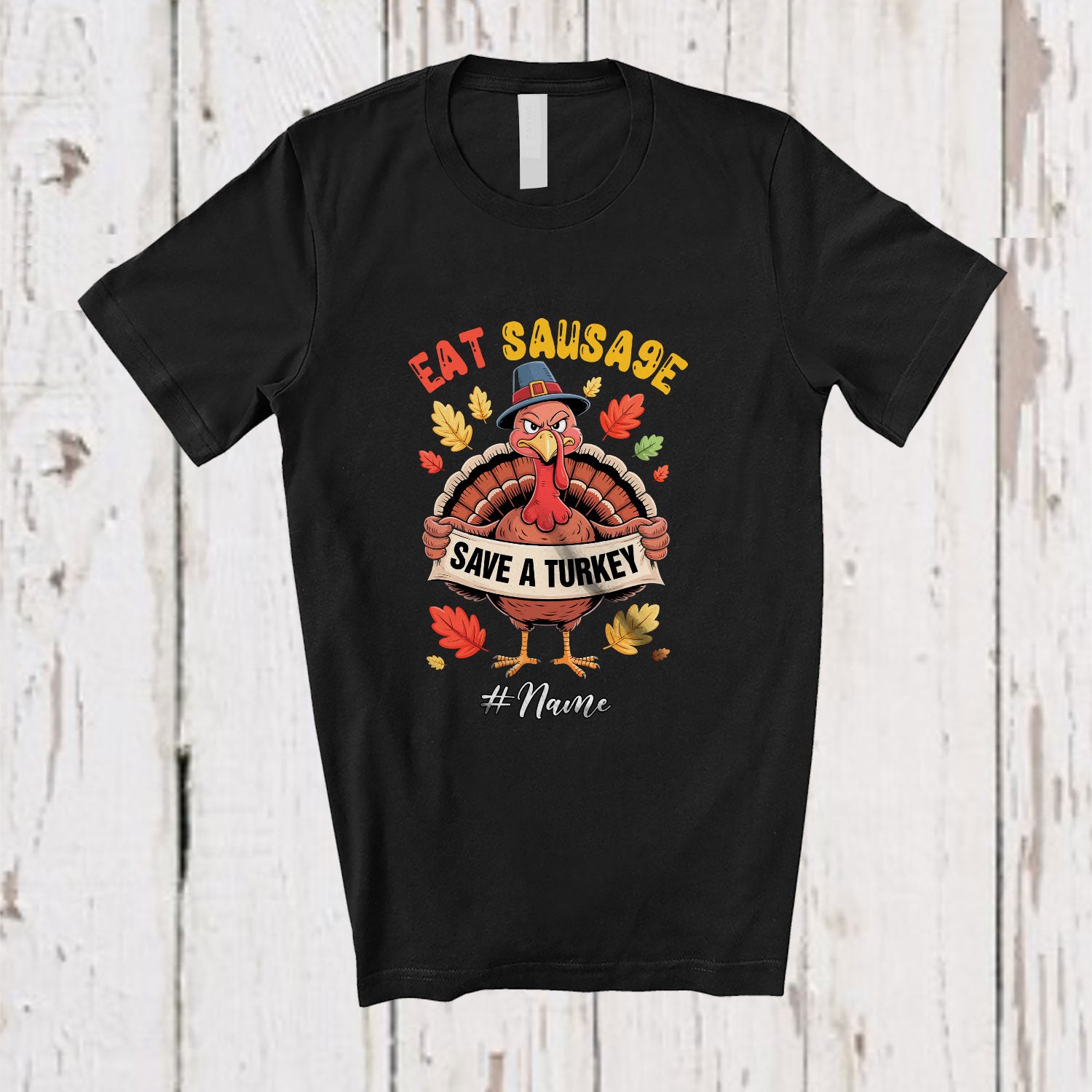 • Personalized Custom Name Save A Turkey Eat Sausage; Humorous Thanksgiving Dinner Family Friends T-Shirt. This cotton t-shirt is a durable staple product with a classic fit. One of the most popular items, it has a relaxed style made for everyday and casual wear.