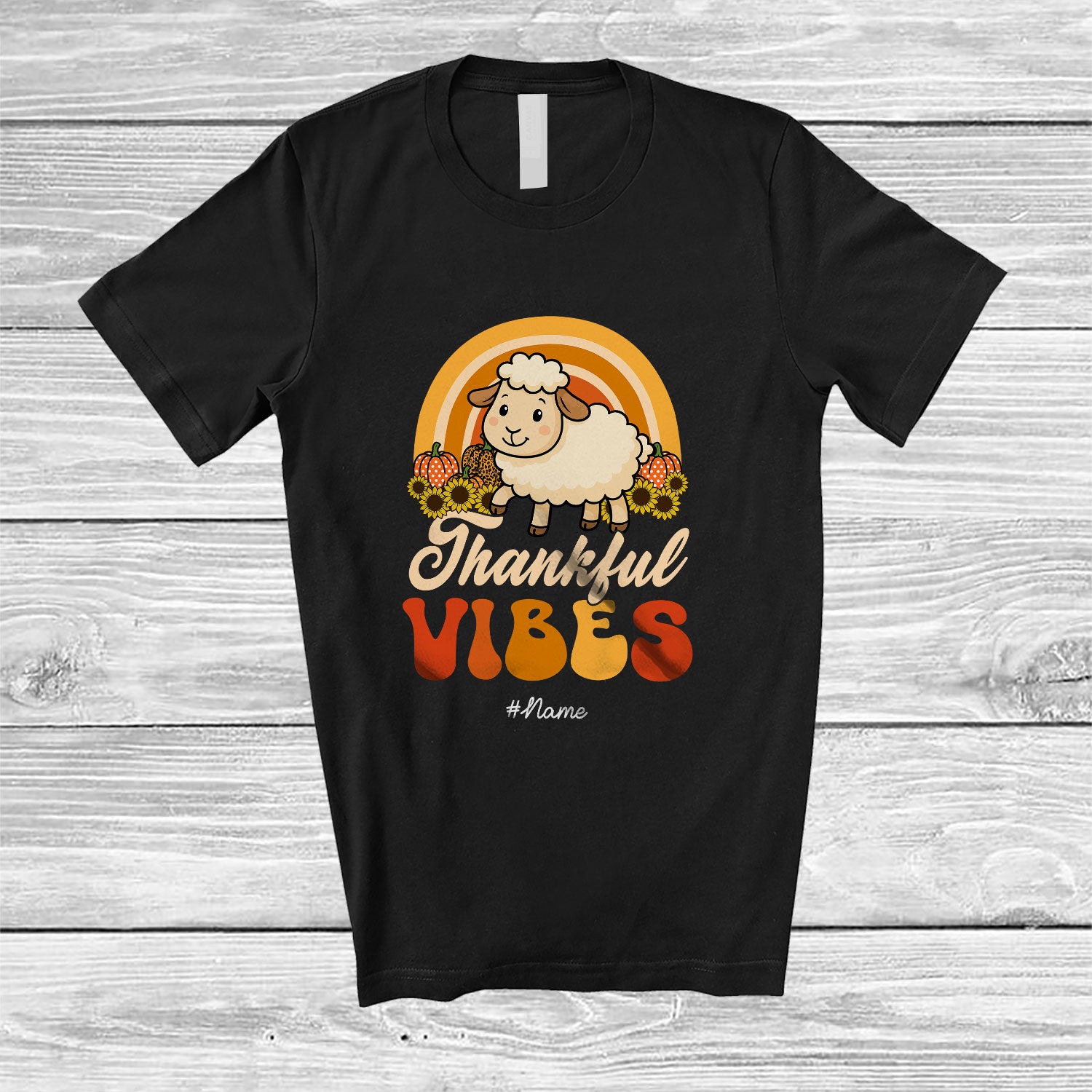 Personalized Custom Name Thankful Vibes; Lovely Thanksgiving Sheep Rainbow; Farmer Family T-Shirt