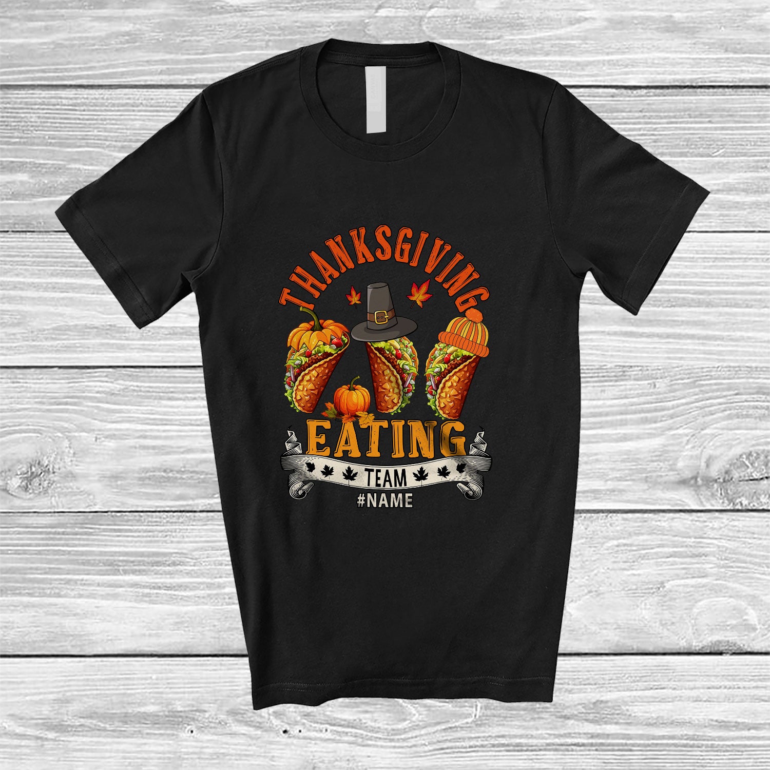 • Personalized Custom Name Thanksgiving Eating Team; Humorous Fall Three Pilgrim Taco; Family T-Shirt. This cotton t-shirt is a durable staple product with a classic fit. One of the most popular items, it has a relaxed style made for everyday and casual wear.