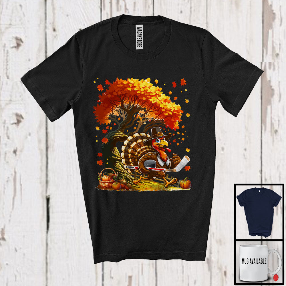 Running Turkey With Hockey Puck, Joyful Thanksgiving Autumn Fall Pilgrim, Sports Player Team T-Shirt