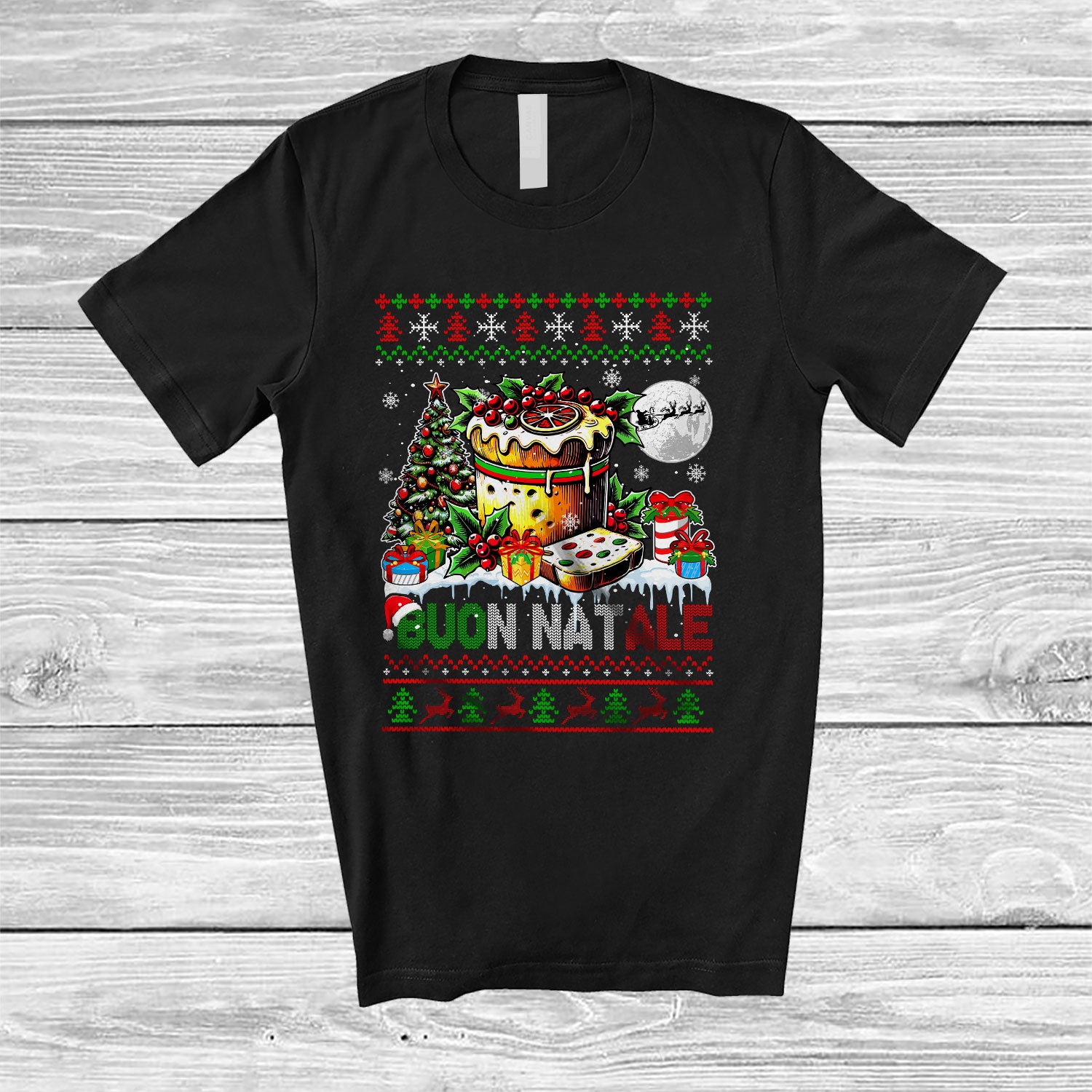 • Buon Natale; Amusing Christmas Tree Sweater Italian Panettone Cake; X-mas Family Group T-Shirt. This cotton t-shirt is a durable staple product with a classic fit. One of the most popular items, it has a relaxed style made for everyday and casual wear.