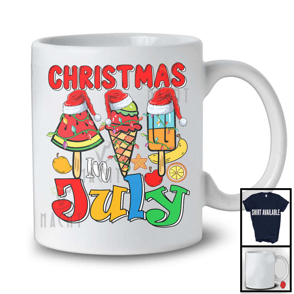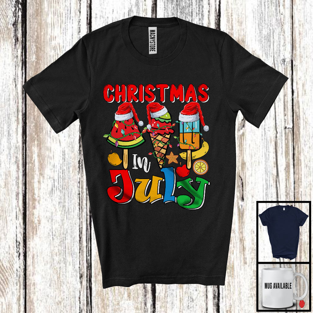 Christmas In July, Colorful Summer Vacation X-mas Lights Watermelon Ice Cream, Santa Fruits T-Shirt