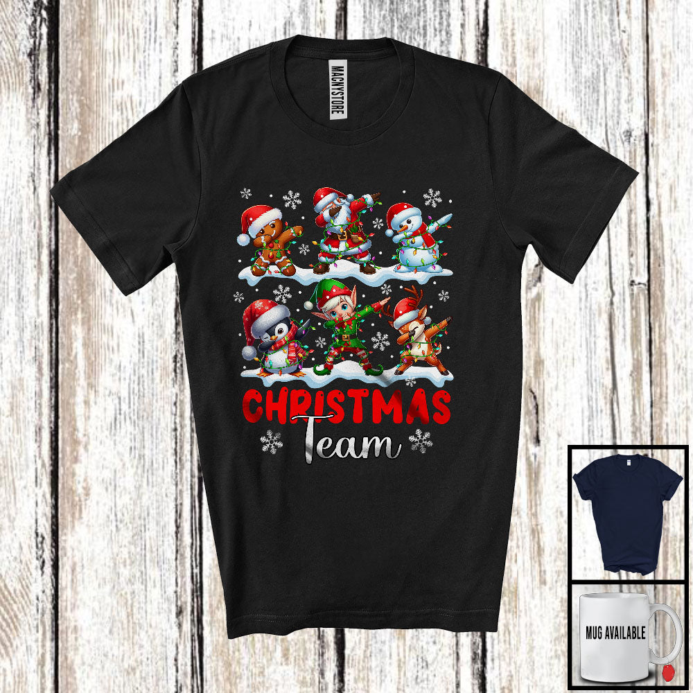 • Christmas Team; Amazing X-mas Christmas Santa Reindeer Elf Snowman Dabbing; Family Group T-Shirt. This cotton t-shirt is a durable staple product with a classic fit. One of the most popular items, it has a relaxed style made for everyday and casual wear.
