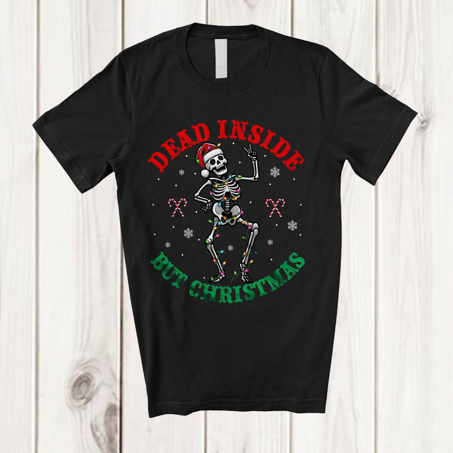 Dead Inside But Christmas; Wonderful Christmas Lights Santa Skeleton; Family Group T-Shirt. This cotton t-shirt is a durable staple product with a classic fit. One of the most popular items, it has a relaxed style made for everyday and casual wear.