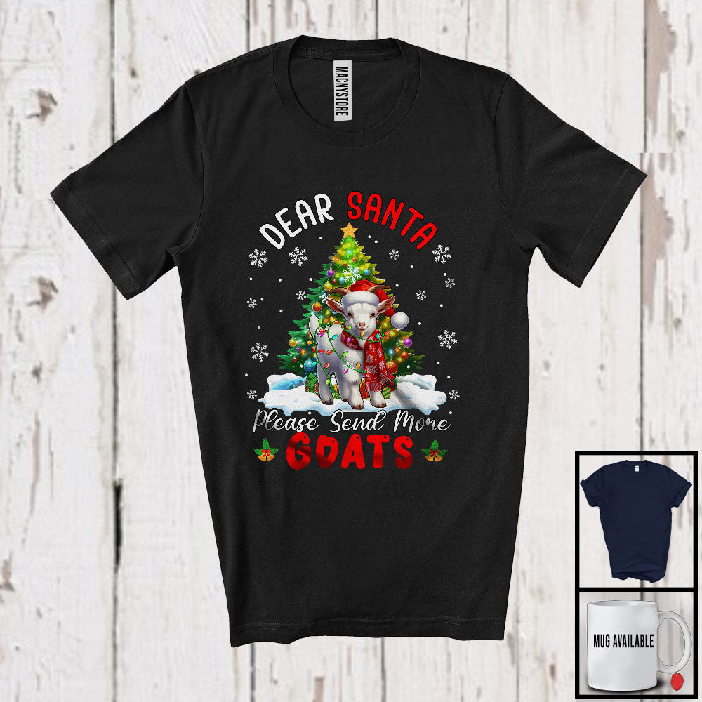 Dear Santa Please Send More Goats; Fantastic Christmas Tree Santa Goat; Farm Animal Farmer T-Shirt. This cotton t-shirt is a durable staple product with a classic fit. One of the most popular items, it has a relaxed style made for everyday and casual wear.