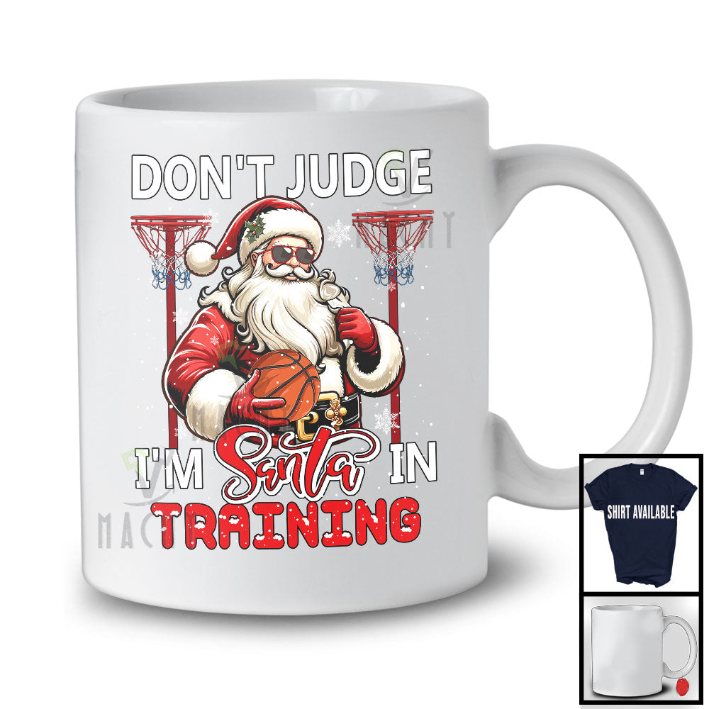 Don't Judge I'm Santa In Training; Sarcastic Christmas Basketball Santa; Snowing X-mas Family T-Shirt. This cotton t-shirt is a durable staple product with a classic fit. One of the most popular items, it has a relaxed style made for everyday and casual wear.