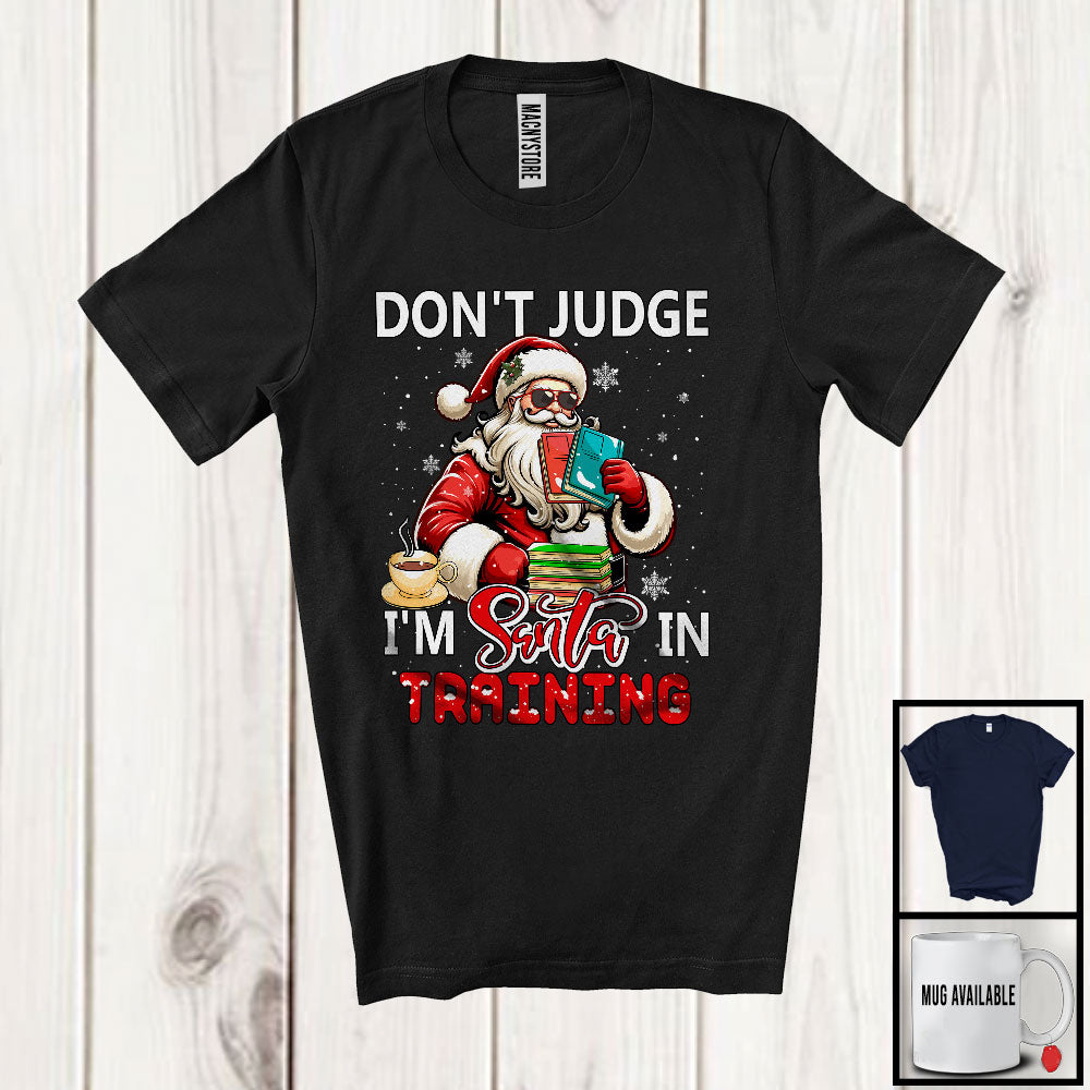 Don't Judge I'm Santa In Training; Sarcastic Christmas Librarian Santa; Snowing X-mas Family T-Shirt. This cotton t-shirt is a durable staple product with a classic fit. One of the most popular items, it has a relaxed style made for everyday and casual wear.