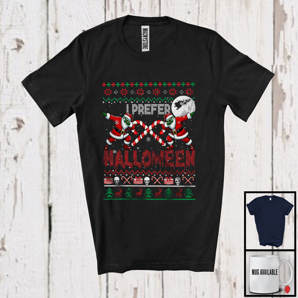 I Prefer Halloween; Humorous Christmas Sweater Zombie Santa Candy Cane Snowing; Family Group T-Shirt. This cotton t-shirt is a durable staple product with a classic fit. One of the most popular items, it has a relaxed style made for everyday and casual wear.