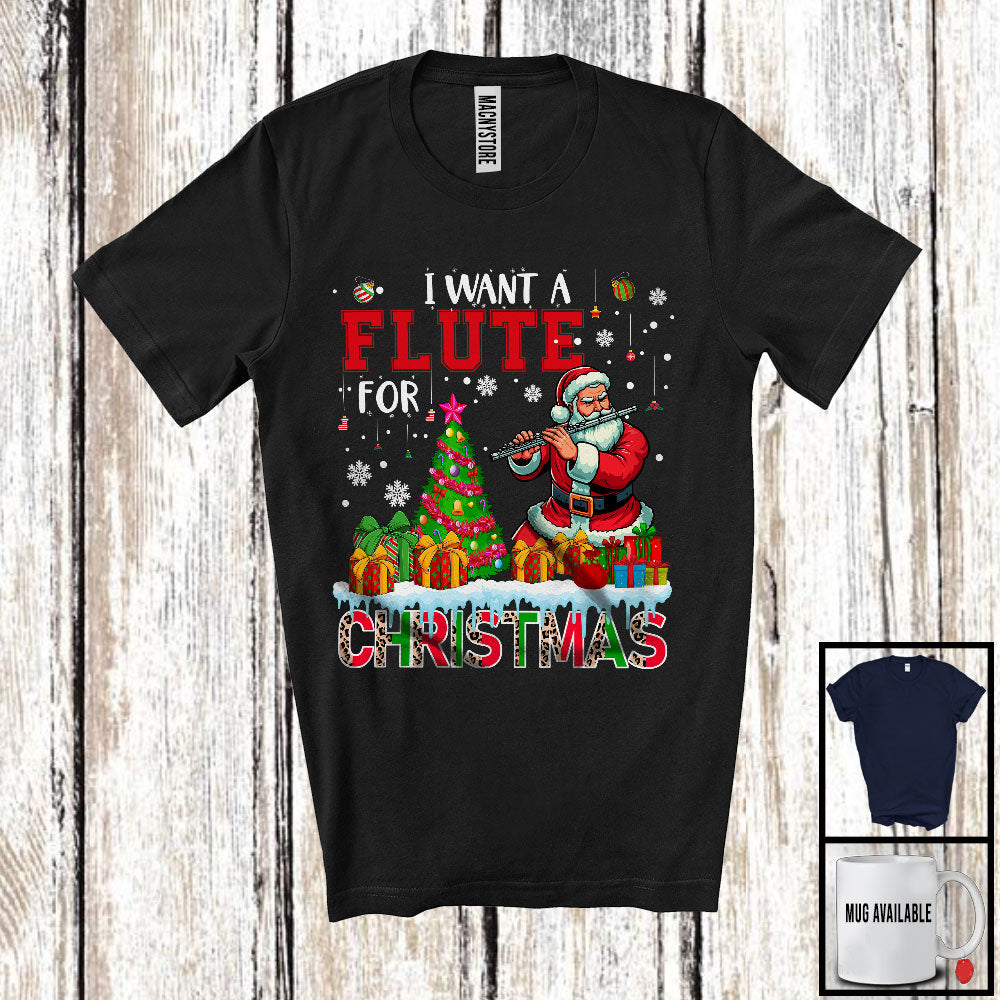 I Want A Flute For Christmas, Adorable X-mas Tree Santa Playing Flute, Musical Instruments T-Shirt