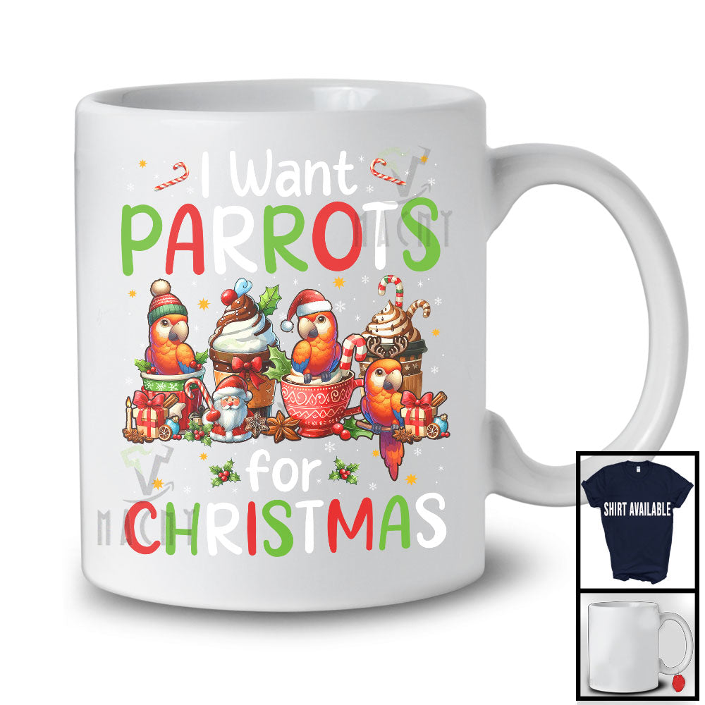 I Want Parrots; Wonderful Christmas Santa Parrot With Hot Coffee; Animal Lover X-mas Group T-Shirt