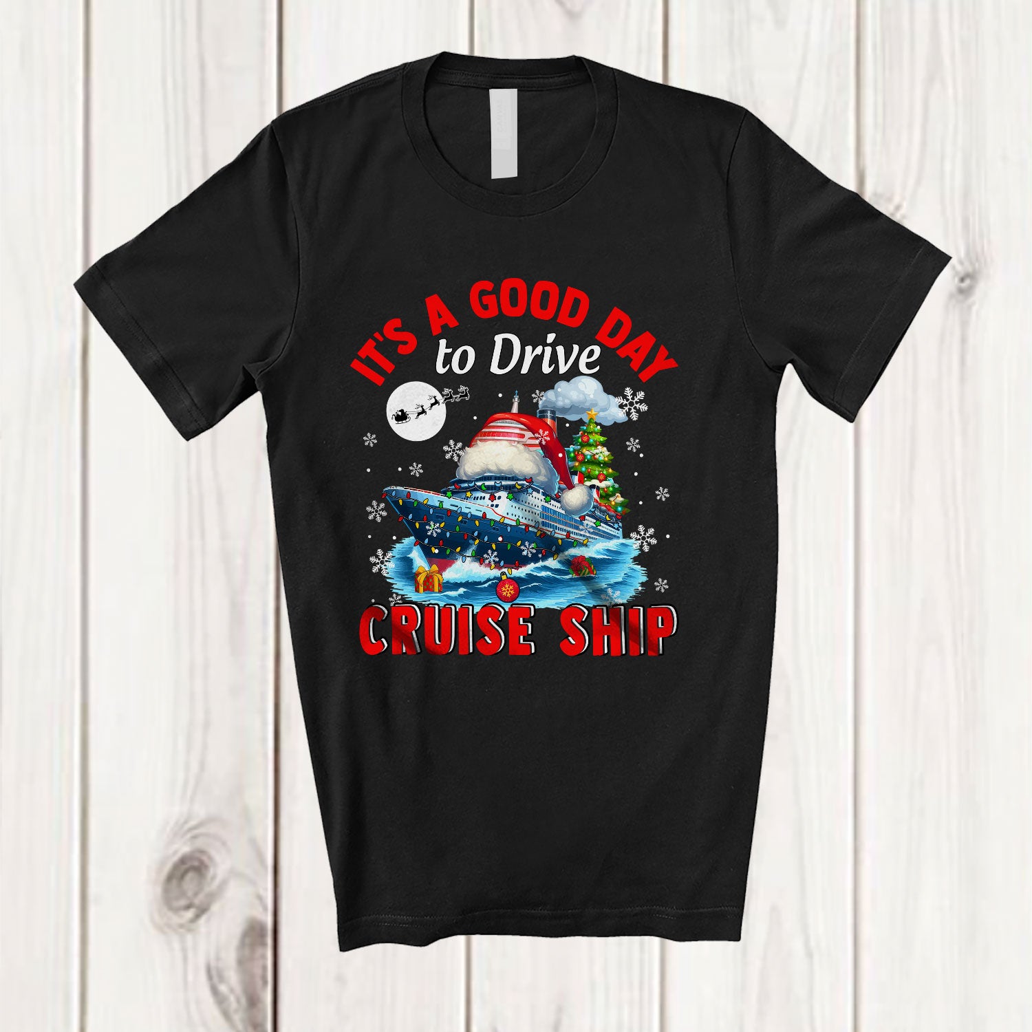 It's A Good Day To Drive Cruise Ship; Amusing Christmas Santa Cruise Ship; X-mas Lights Family T-Shirt. This cotton t-shirt is a durable staple product with a classic fit. One of the most popular items, it has a relaxed style made for everyday and casual wear.