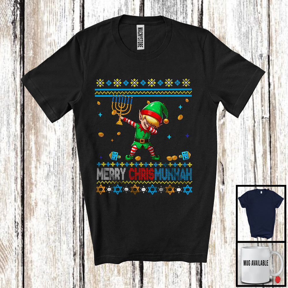 • Merry Chrismukkah; Joyful Christmas Hanukkah Sweater Dabbing Elf; Holding Menorah Family T-Shirt. This cotton t-shirt is a durable staple product with a classic fit. One of the most popular items, it has a relaxed style made for everyday and casual wear.